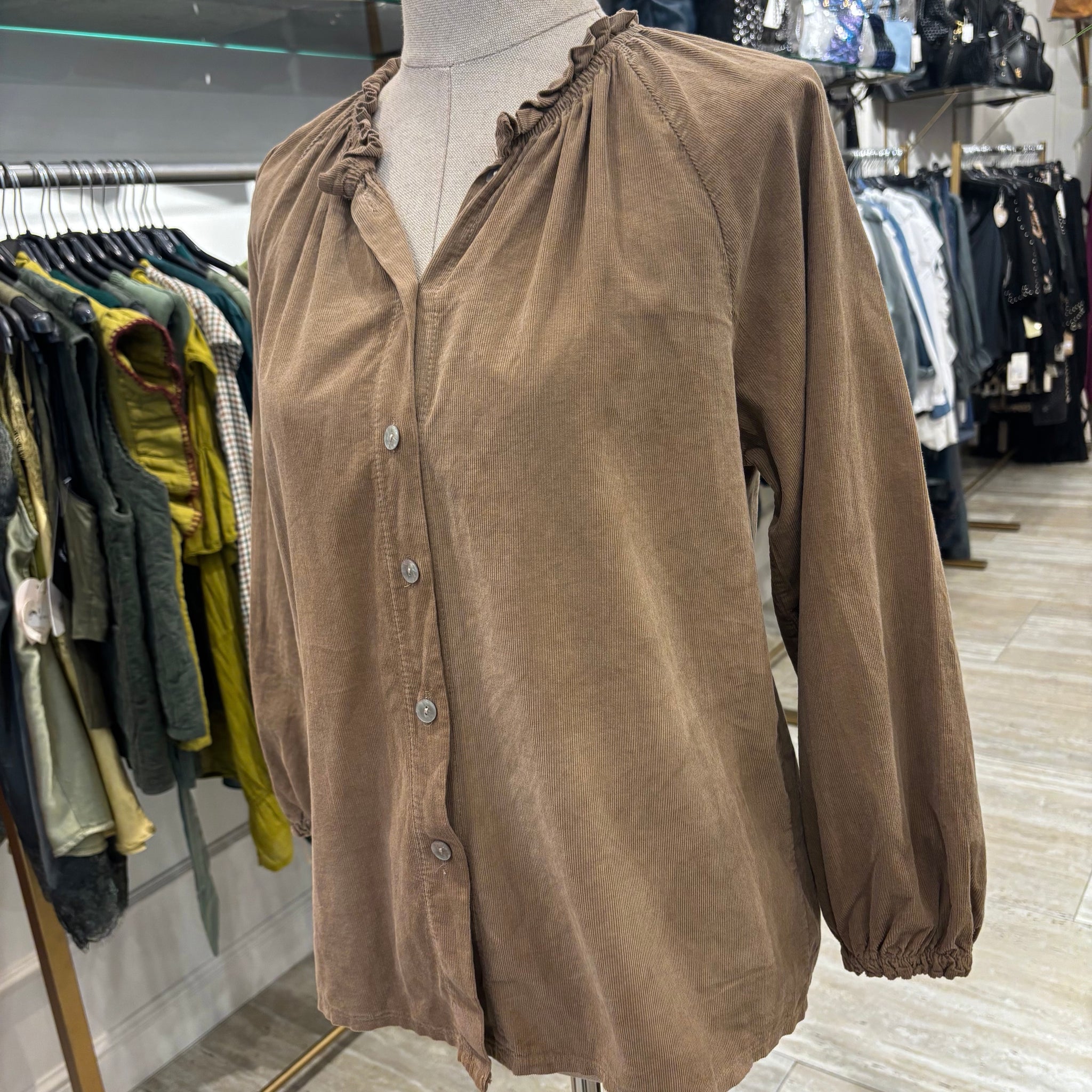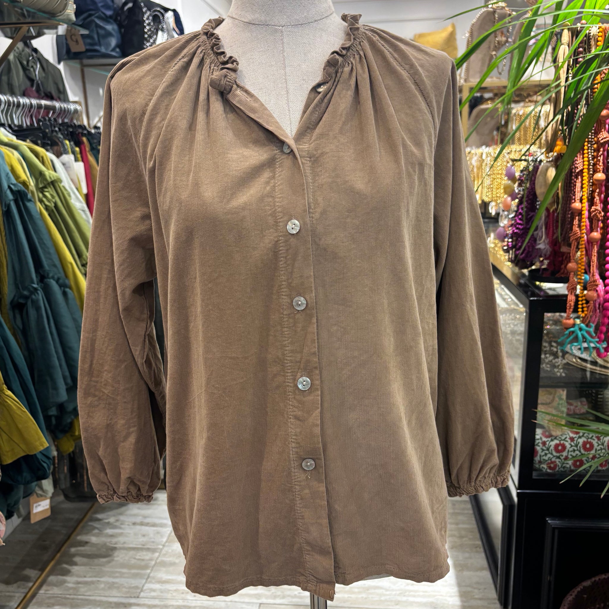 Blusa con botones de micropana en color camel, de talla única.