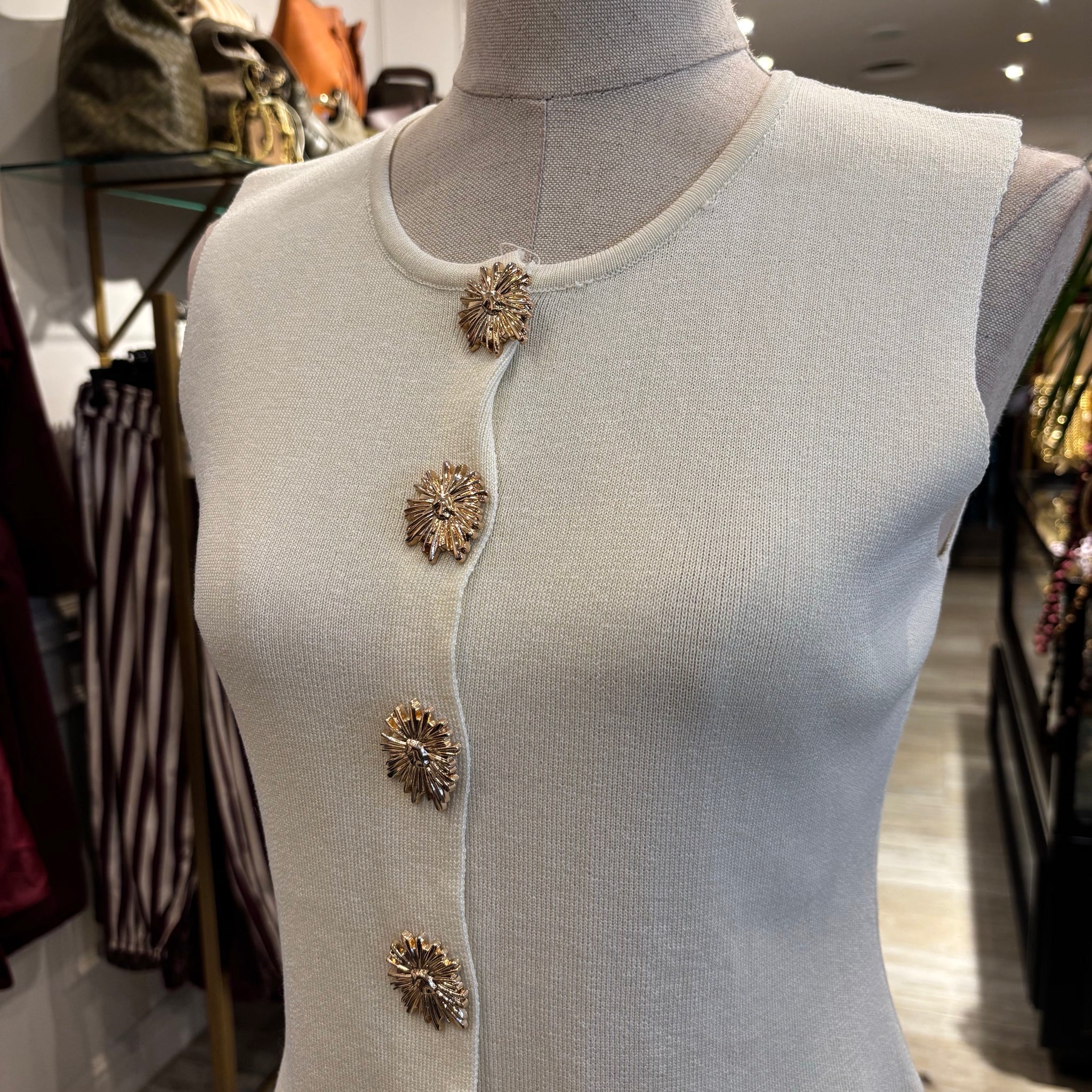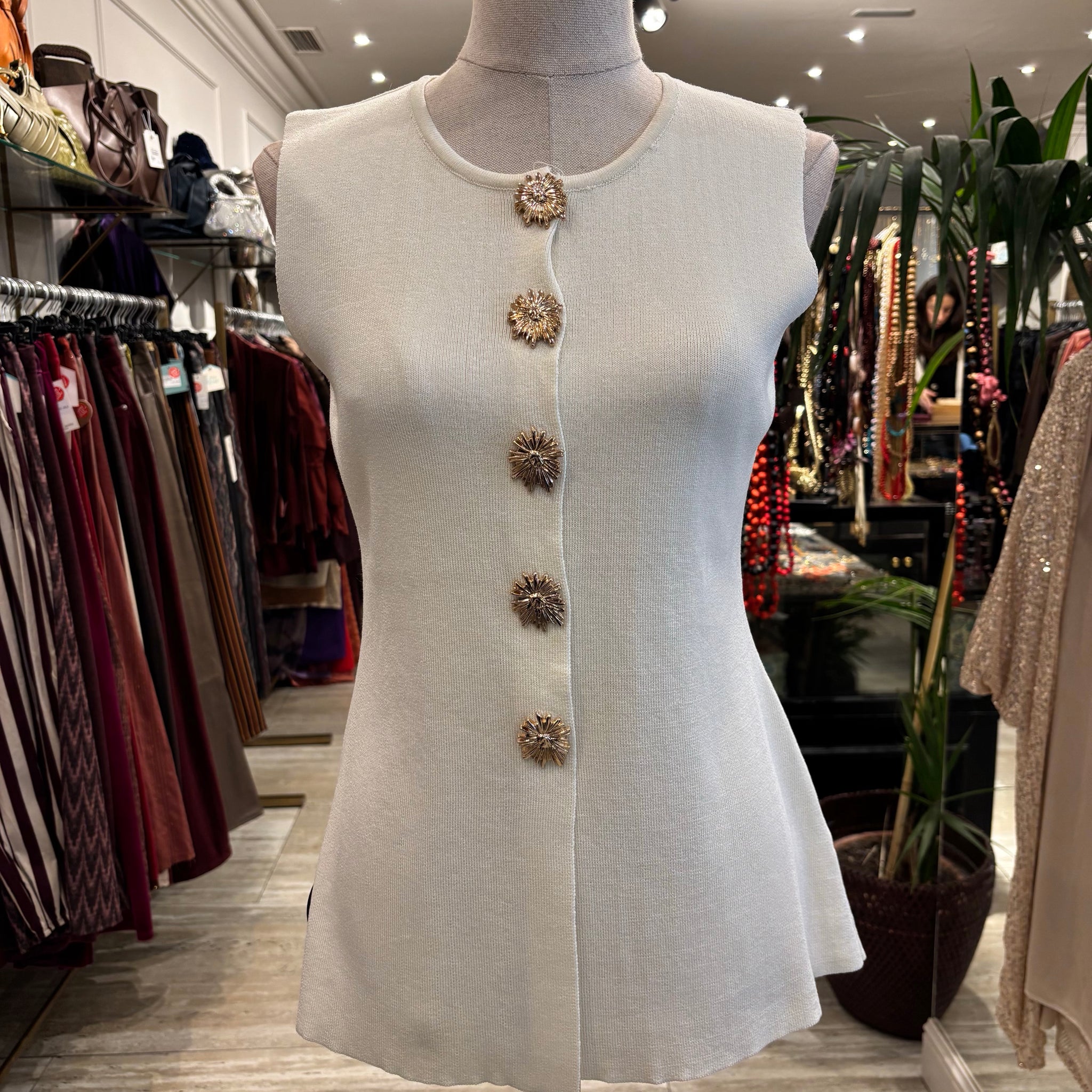 Chaleco beige con botones dorados, talla única.