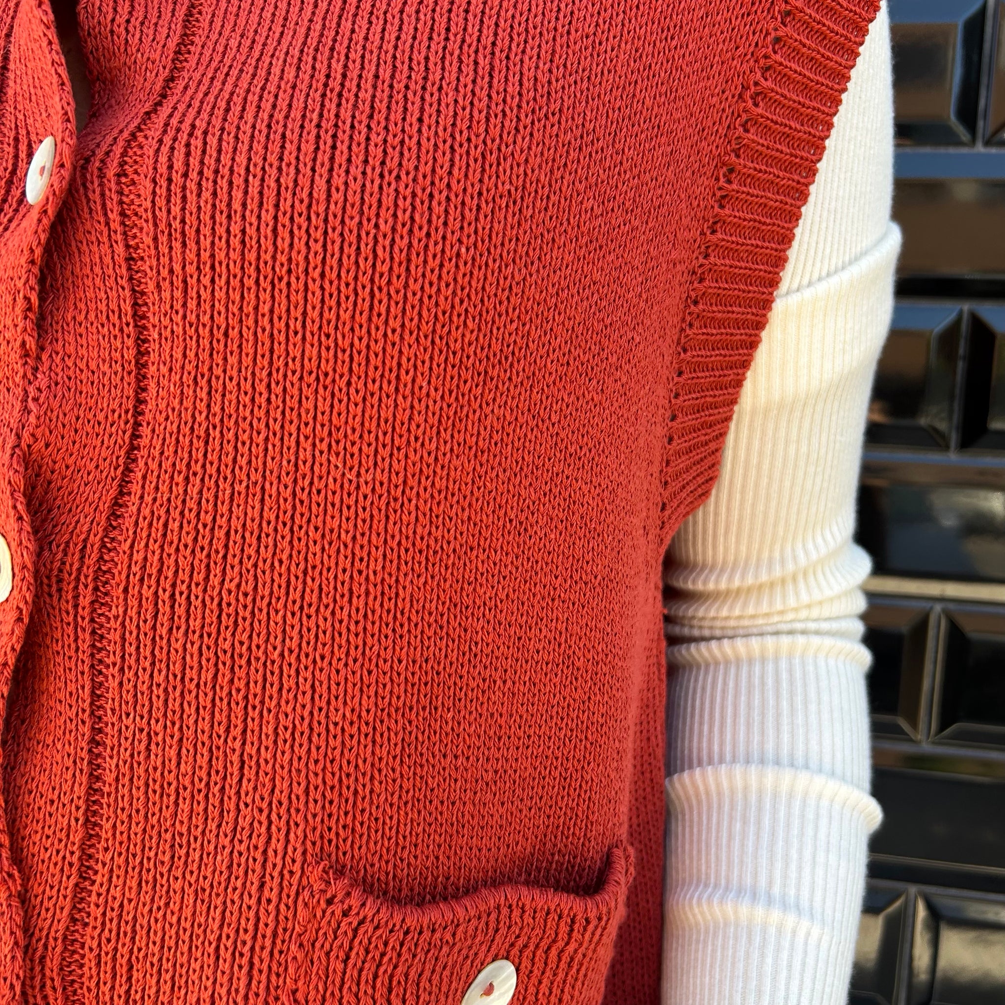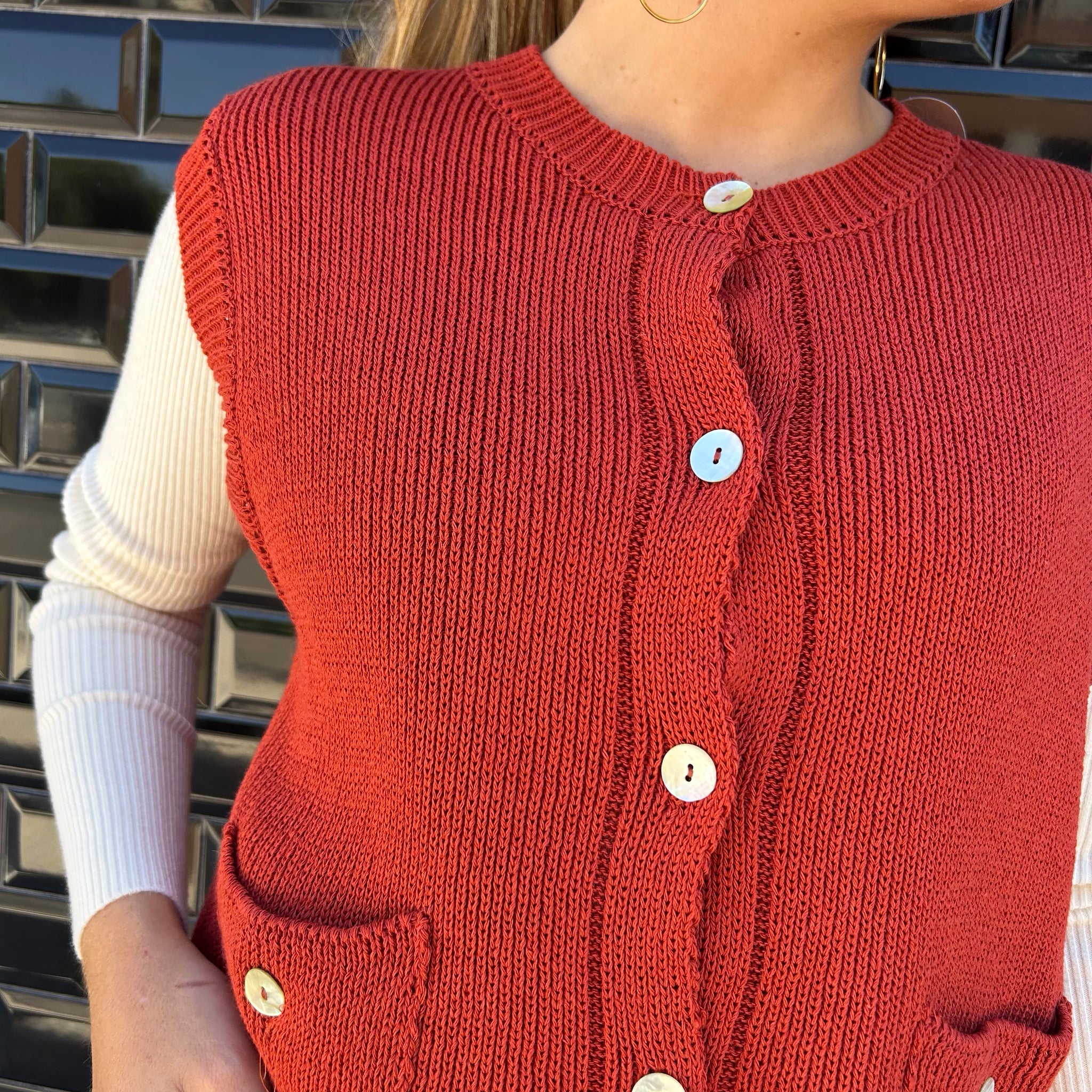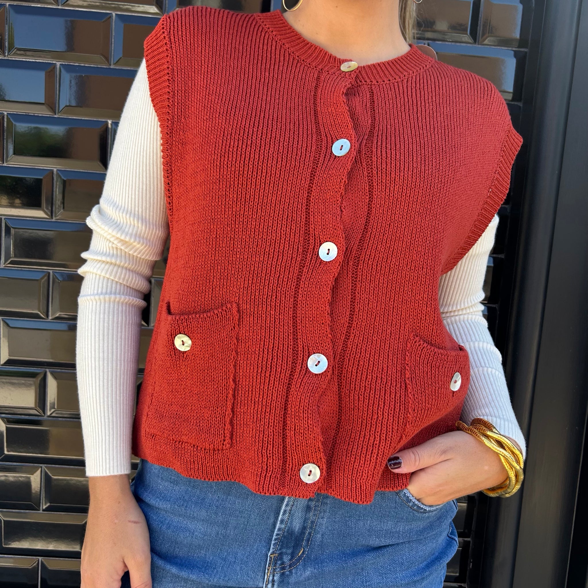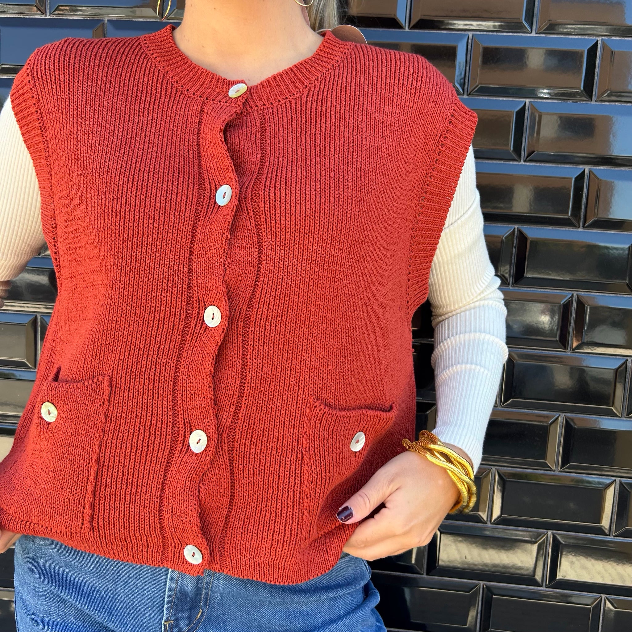 Chaleco con bolsillos delanteros en color teja, de talla única.