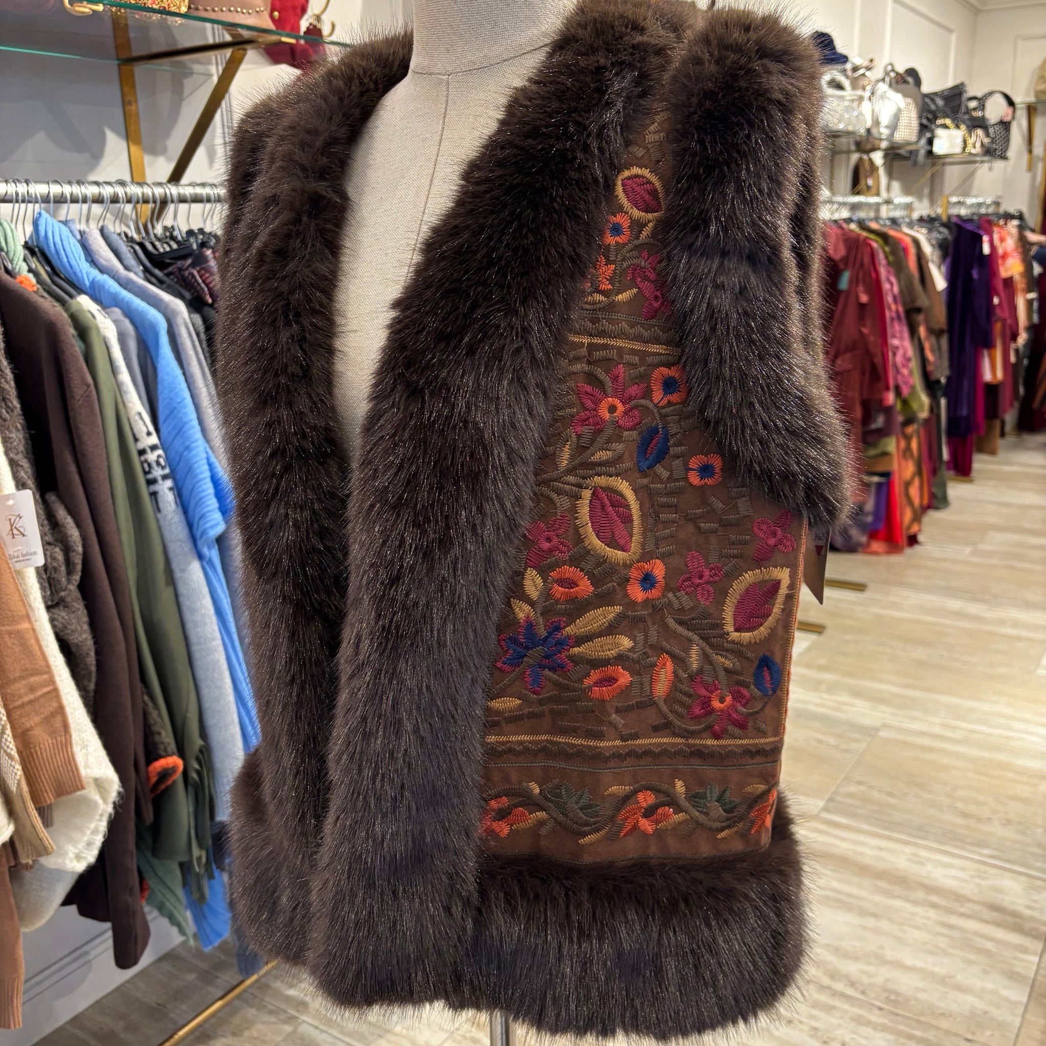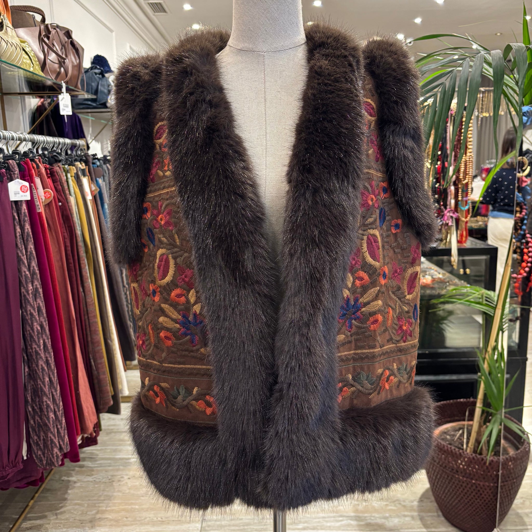 Chaleco de pelo sintético y bordado, talla única.