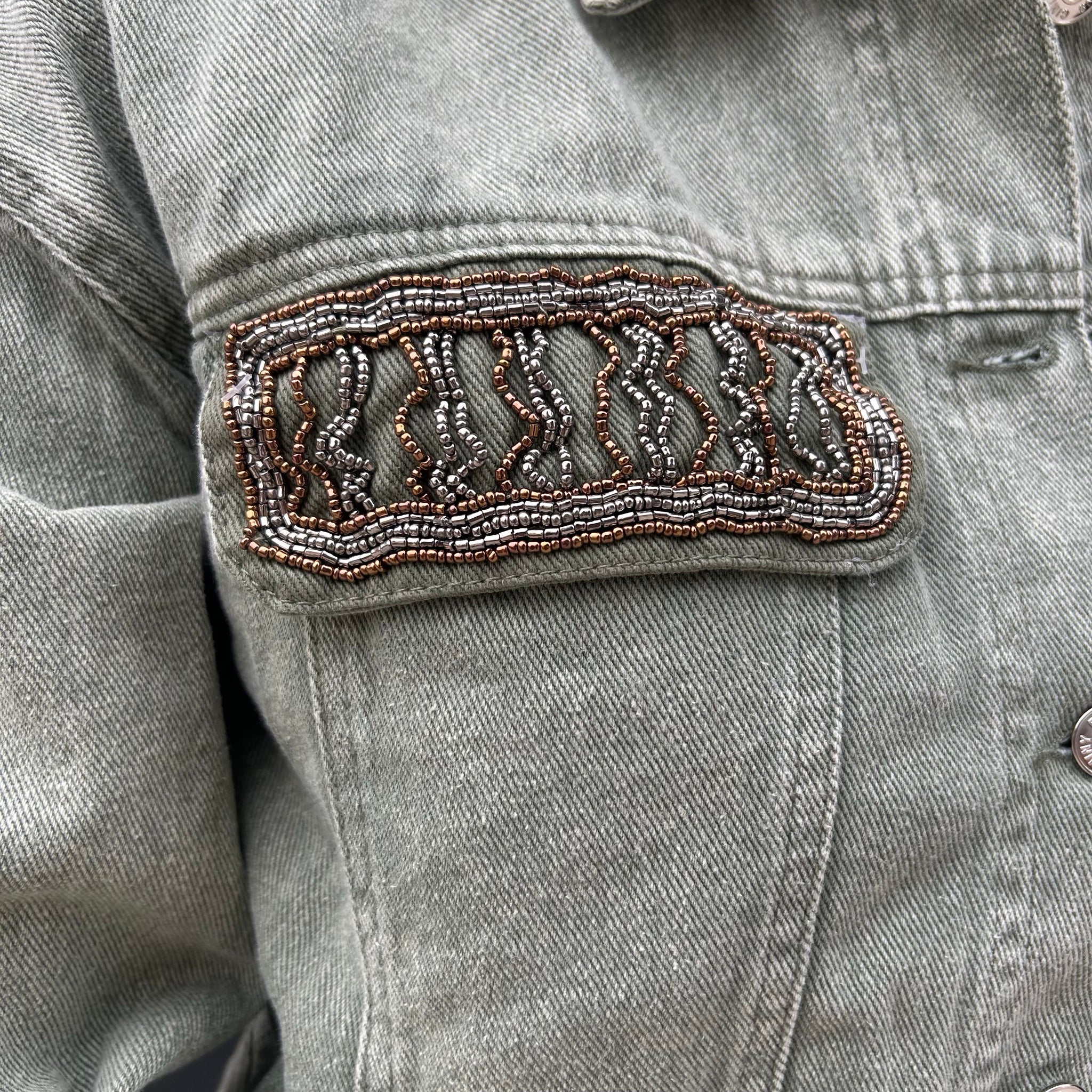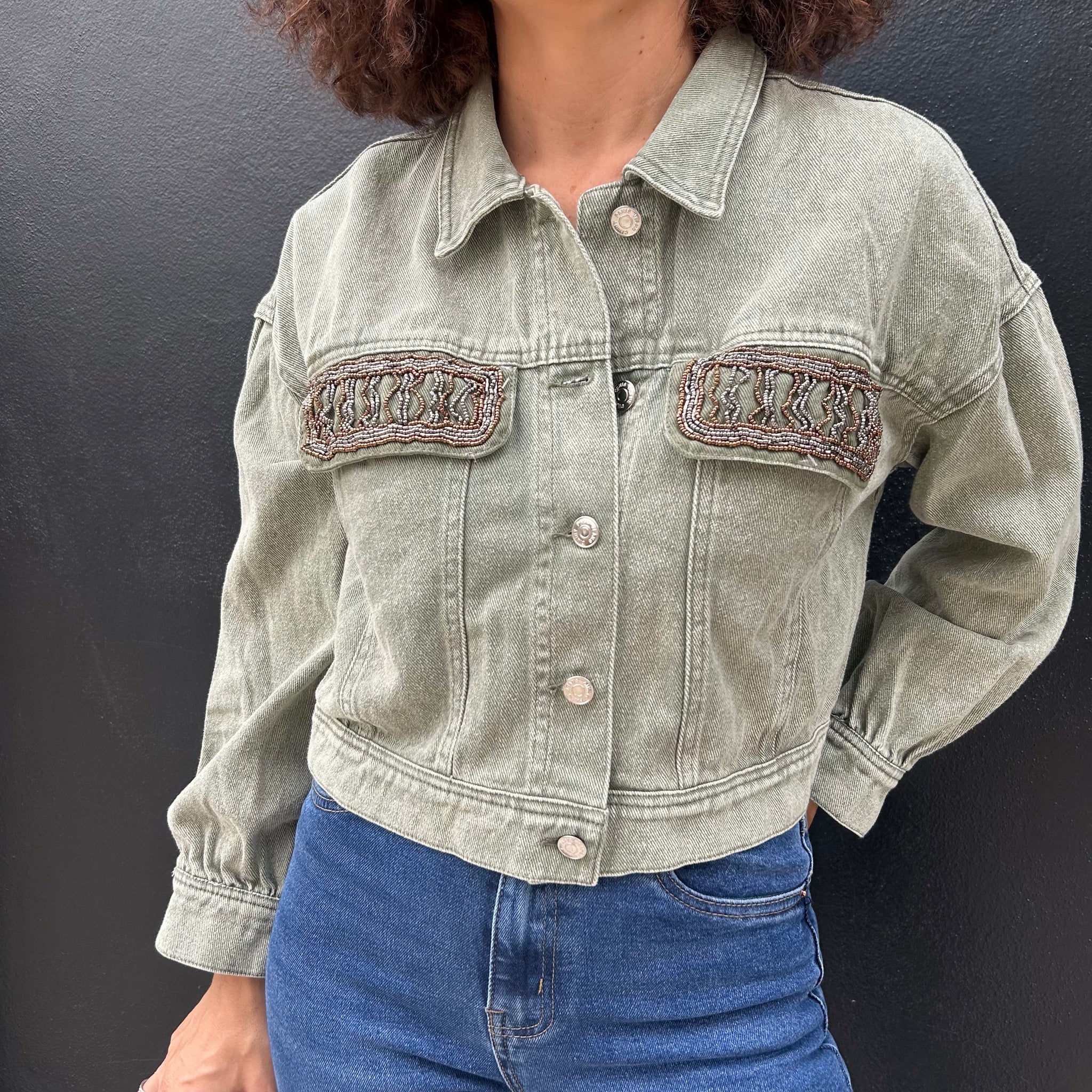 chaqueta vaquera en verde cacería, trae un detalle en los bolsillos del pecho y es de talla única.