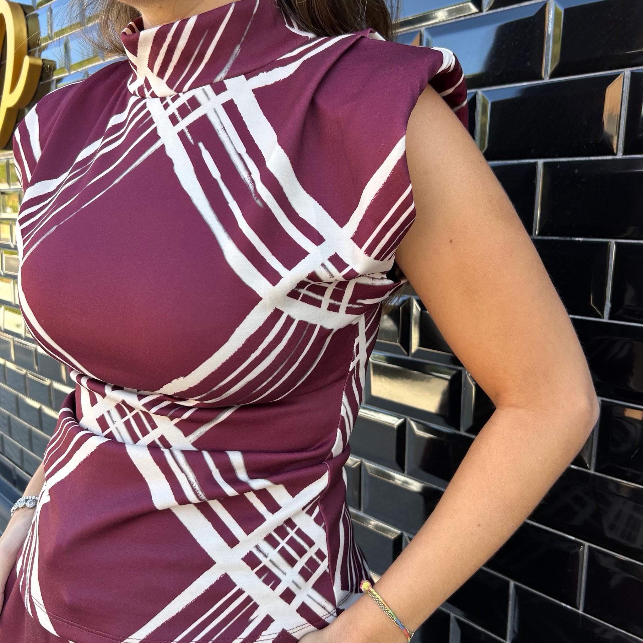 Conjunto de top y pantalón burdeos con rayas beige de talla única.