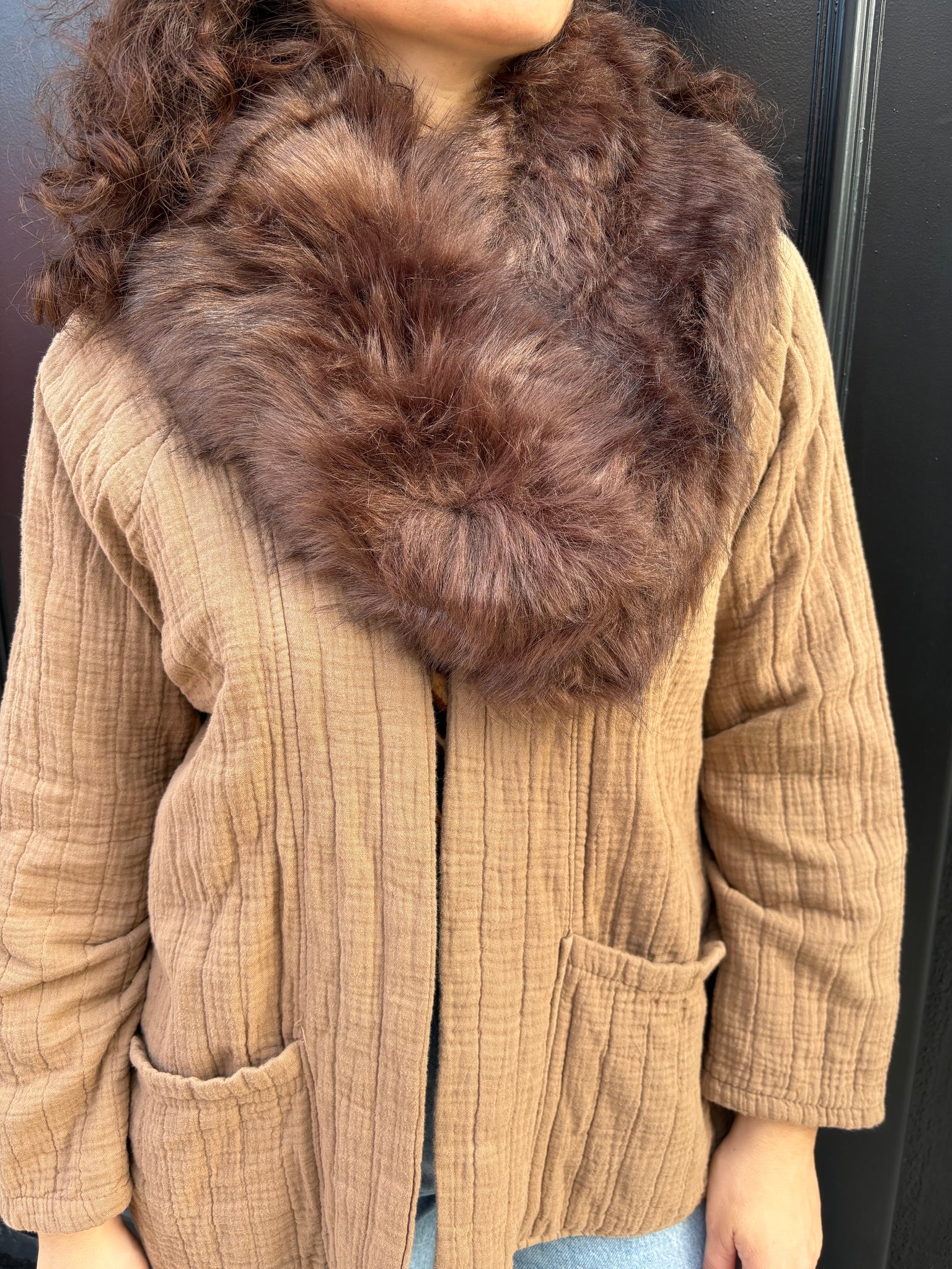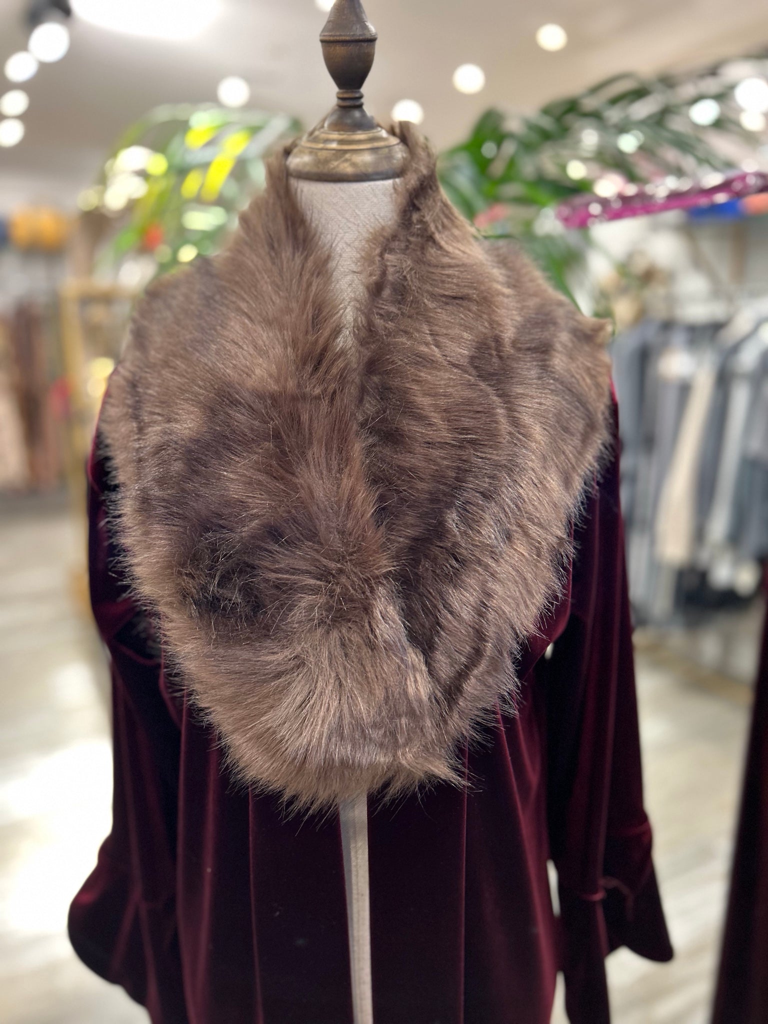 Cuello de pelo sintético, lleva pinza, de largo mide 88 centímetros aproximadamente, y de ancho mide 16 centímetros aproximadamente