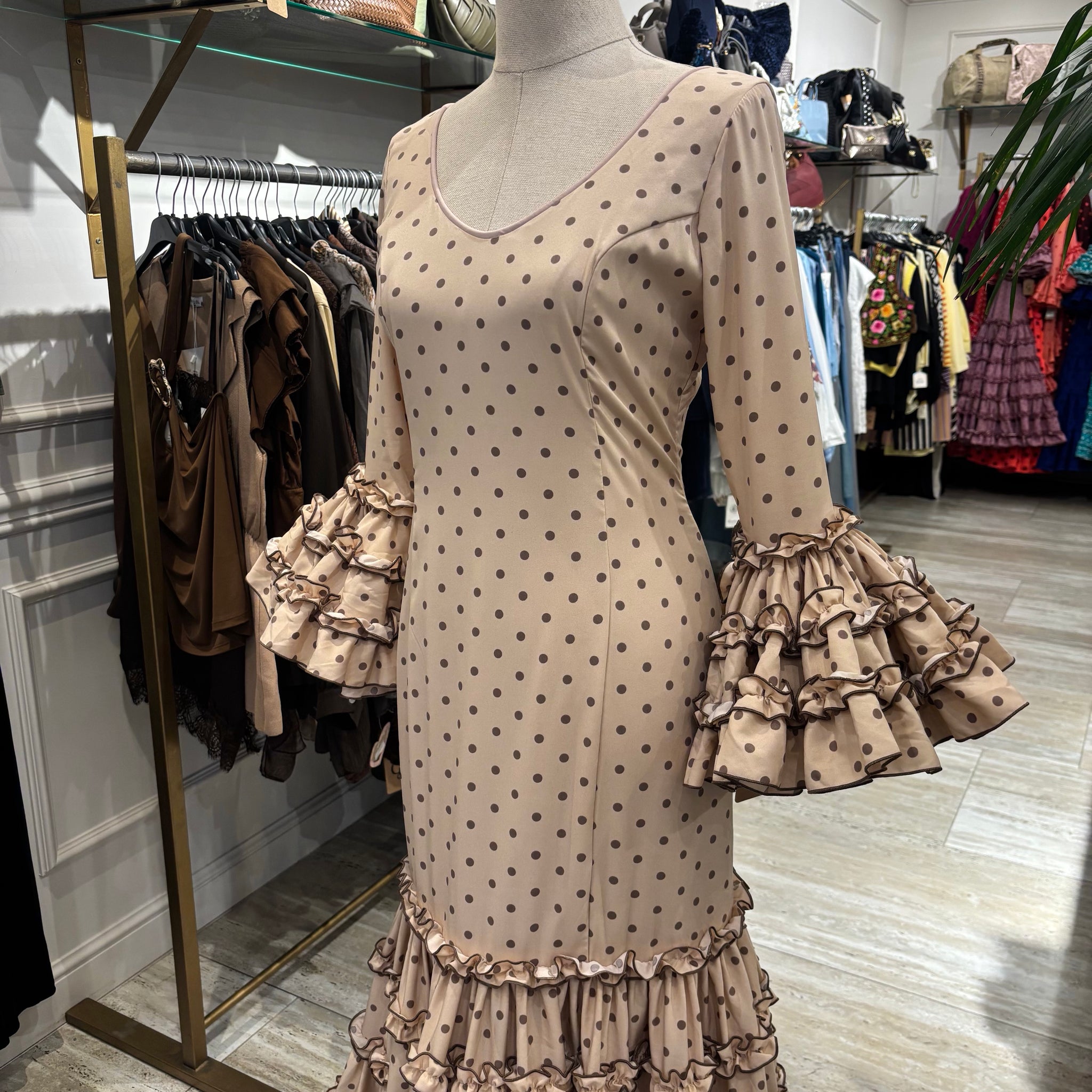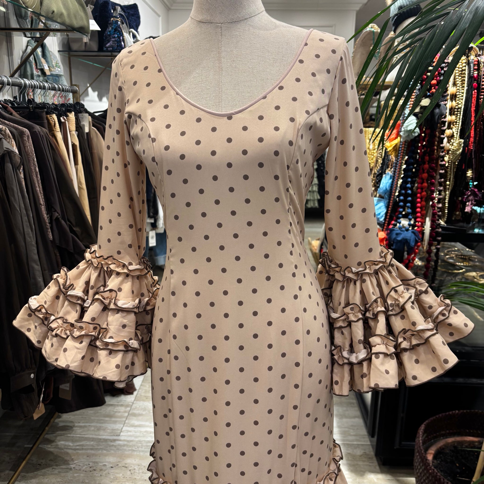 Traje de flamenca de estilo elegante con delicado estampado de lunares, escote delantero y trasero de pico, ajustable con cordoncillo. Destaca por su corte entallado que realza la silueta y su falda larga con varios volantes fruncidos, manga al codo con volantes fruncidos a juego de la falda.