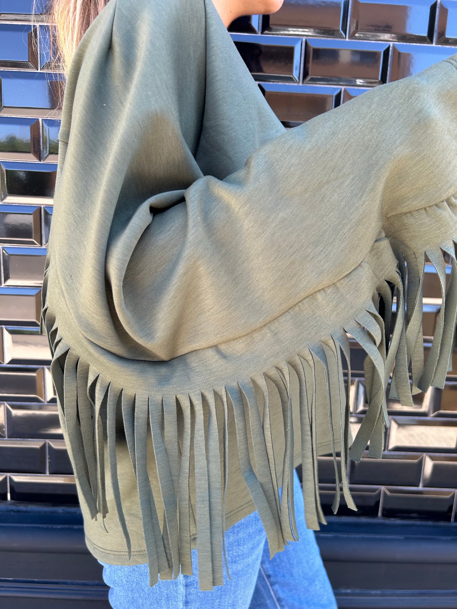 Sudadera oversize con flecos en la parte trasera en color verde, de talla única.
