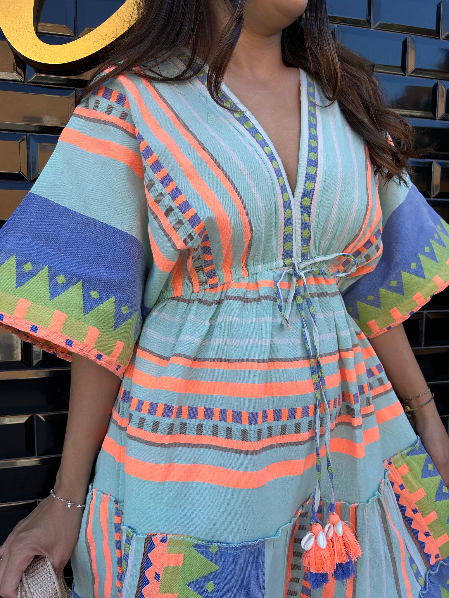 Modelo de talla única. Válido para talla 36, 38, 40 y 42. El modelo de largo mide 93 centímetros aproximadamente. El tejido es 100 % algodón.